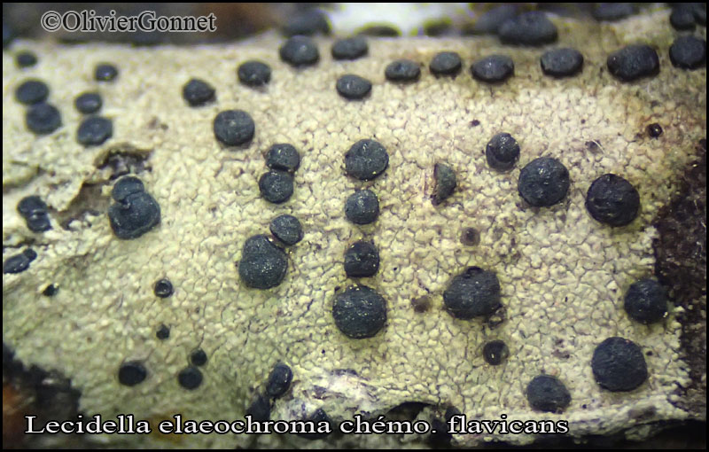 - Apothécies : lécidéines, 0,3-1 mm de Ø, à disque noir dont le rebord