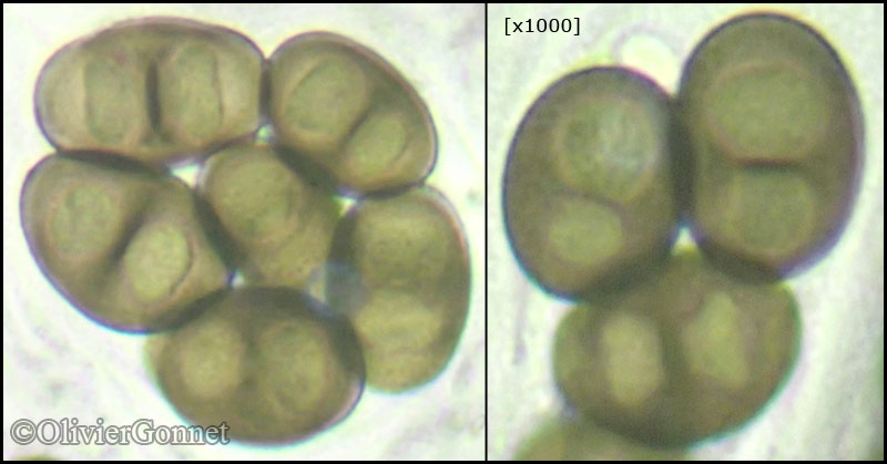 noir. Spores uniseptées, par 8, 13-24 x 8-12 µm, à lumen arrondi à