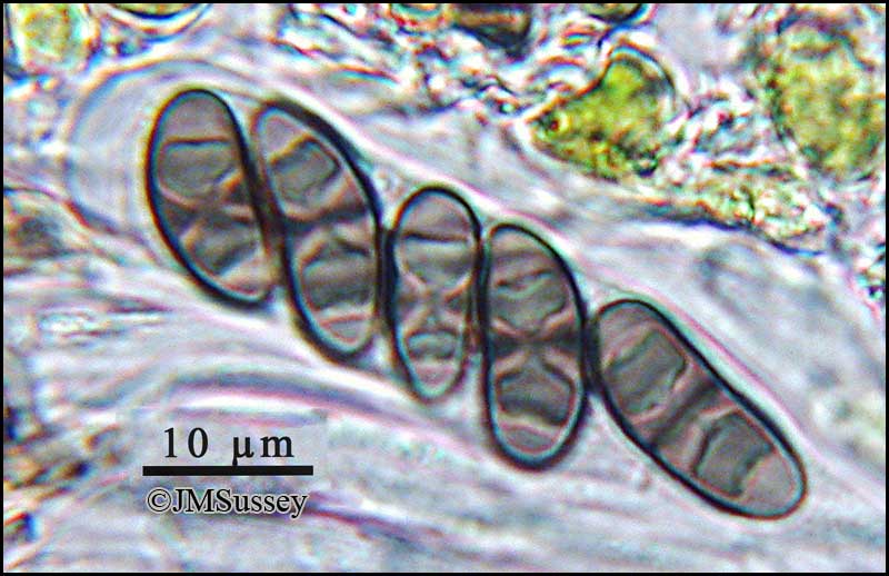 Épithécium brun foncé. Hypothécium incolore. Spores ellipsoïdales, de
