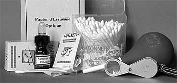 le nettoyant optique, la poire soufflante, les coton-tiges,